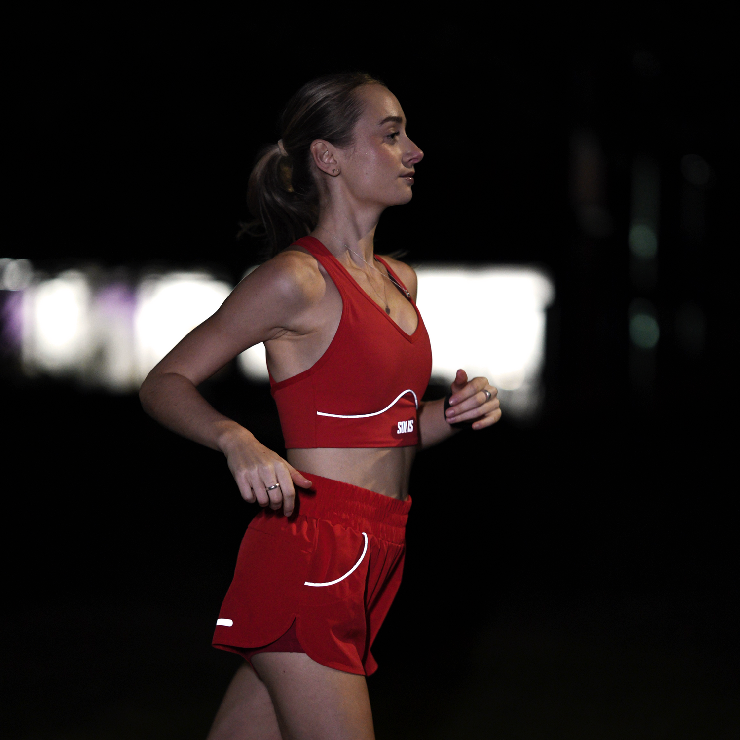 Our matching reflective sports bra and shorts support your pace from first light to streetlight.